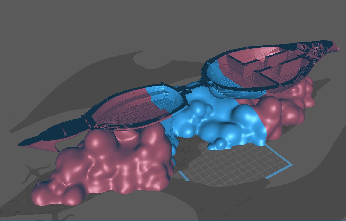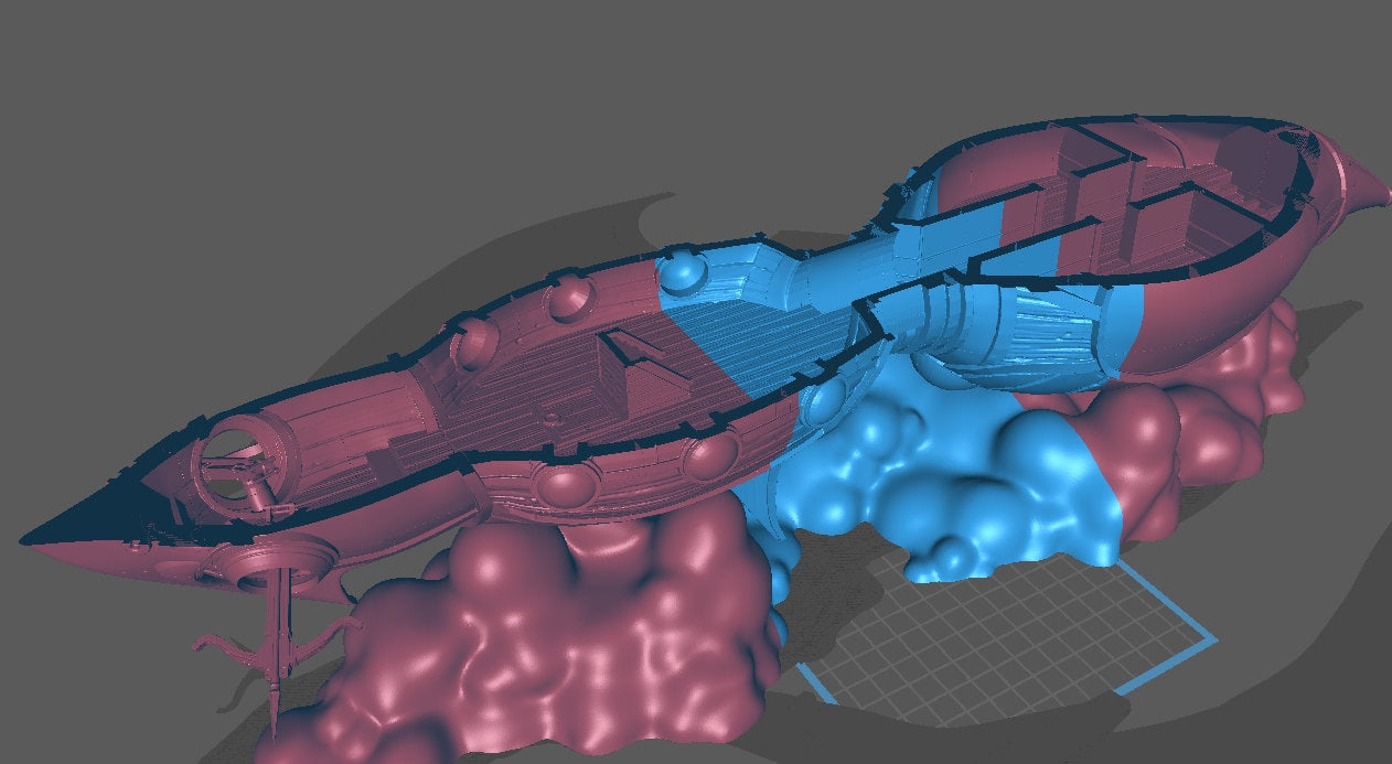 Printed to 28mm scale. This is an oversized terrain piece with three internal layers. Cutaway screenshots show internal rooms/holds.